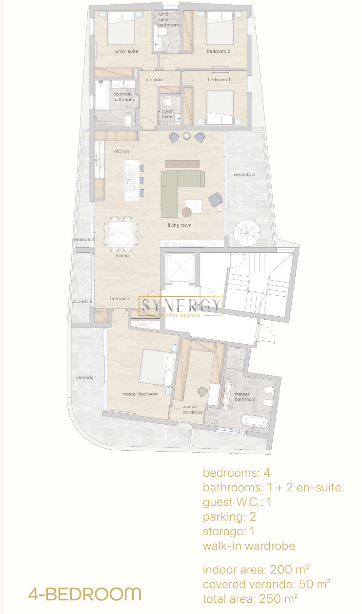 The apartment consists of an open-plan kitchen/ living room/ dining area, four bedrooms - two of which are en-suite, a family bathroom, a guest toilet and a large covered veranda. Additionally, the property will offer a spacious roof garden with a private swimming pool and beautiful panoramic sea & city views.