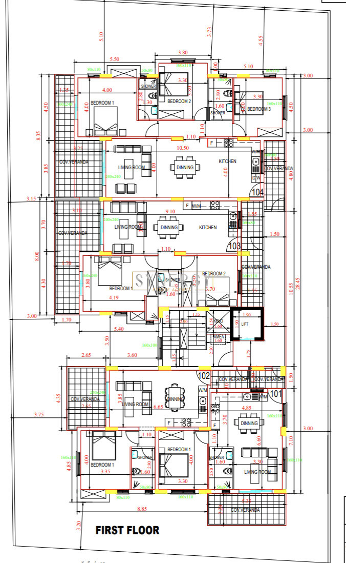 The apartment consists of an open-plan kitchen/ living room/ dining area, three bedrooms (master with en-suite facilities), a family bathroom, and a covered veranda.
