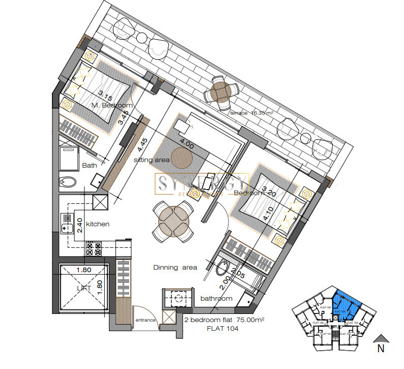 The apartment consists of an open-plan kitchen/ living room/ dining area, two bedrooms - the main with en-suite facilities, a bathroom and a large covered veranda.